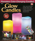 Glow Candles - As Seen On TV with Remote Control! Set of 3 real wax candles are flame-less, drip-less and have the option of steady glow OR flicker effect. Set to your favorite color, or cycle through 12 different hues to match any season, any occasion! Each LED candle uses 3 AAA batteries, not included. Remote includes replaceable button battery. Built-in timer for automatic shutoff. Candles are 6", 5" and 4".